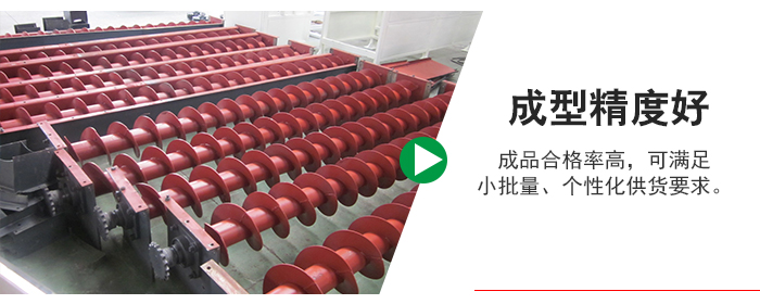 4、 與連軋技術(shù)相比,成型精度好,成品合格率高,可滿(mǎn)足小批量、個(gè)性化供貨要求,特別適用于大規(guī)格,大厚度及耐磨鋼、不銹鋼材料的螺旋葉片生產(chǎn)。