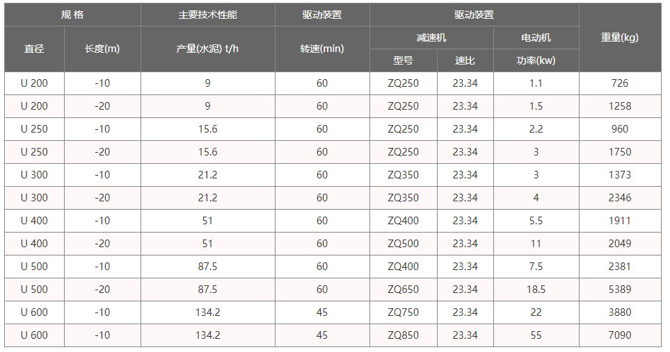 U型螺旋輸送機(jī)工作時(shí),電機(jī)帶動(dòng)旋轉(zhuǎn)的螺旋葉片將物料推移而進(jìn)行輸送,螺旋輸送機(jī)旋轉(zhuǎn)軸上焊的螺旋葉片,葉片的面型根據(jù)輸送物料的不同有實(shí)體面型、帶式面型、葉片面型等型式。使物料不與螺旋輸送機(jī)葉片一起旋轉(zhuǎn)的力是物料自身重量和螺旋輸送機(jī)機(jī)殼對(duì)物料的摩擦阻力。參數(shù)如下: