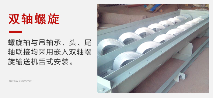 螺旋軸與吊軸承、頭、尾軸聯(lián)接均采用嵌入雙軸螺旋輸送機(jī)舌式,安裝、拆卸不需要軸向移動,維修方便。芯軸長、吊掛少、故障點少。