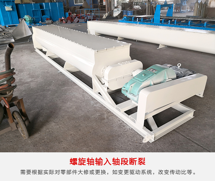 由于螺旋給料機(jī)安裝時(shí),螺旋軸同軸度超差或選軸時(shí)安全系數(shù)偏低等引起,根據(jù)生產(chǎn)需要進(jìn)行設(shè)備改造維護(hù),當(dāng)工藝變化,超出設(shè)備性能范圍時(shí),繼續(xù)運(yùn)行會(huì)造成設(shè)備快速損壞,甚至滿足不了生產(chǎn)工藝要求,影響正常生產(chǎn)。需要根據(jù)實(shí)際情況和現(xiàn)場條件,對零部件大修更換,如變更驅(qū)動(dòng)系統(tǒng),改變傳動(dòng)比,提高備件材料性能或尺寸變化,直至更換設(shè)備。