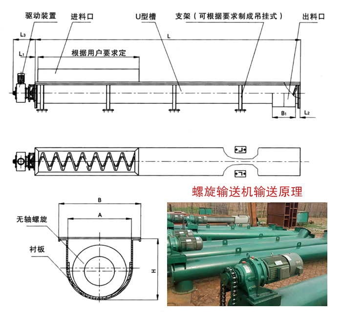 2、螺旋輸送機(jī)使用的環(huán)境溫度為—20~50℃ ;輸送機(jī)的傾角β≤20°;輸送長度一般小于40m,最長不超過70m。