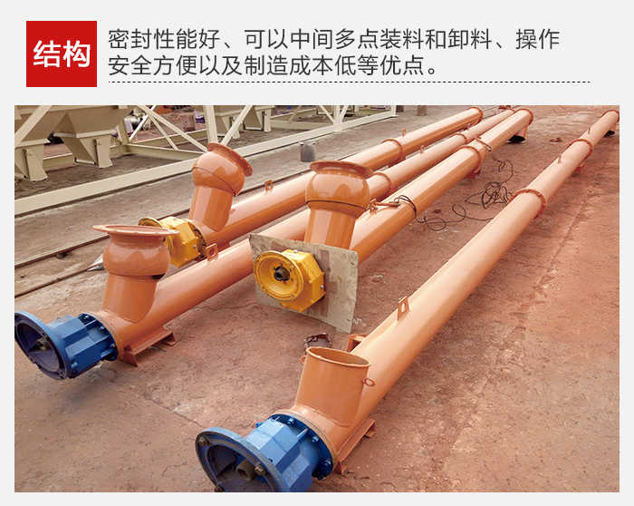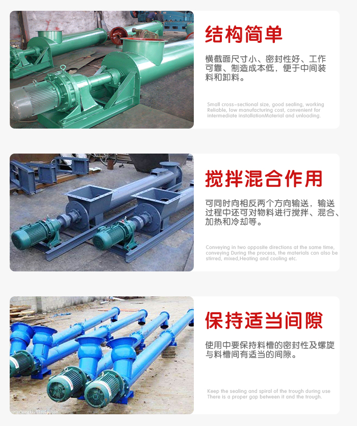 結(jié)構(gòu)簡單、橫截面尺寸小、密封性好、工作可靠、制造成本低,便于中間裝料和卸料,輸送方向可逆向,也可同時向相反兩個方向輸送。輸送過程中還可對物料進(jìn)行攪拌、混合、加熱和冷卻等作業(yè)。通過裝卸閘門可調(diào)節(jié)物料流量。但不宜輸送易變質(zhì)的、粘性大的、易結(jié)塊的及大塊的物料。輸送過程中物料易破碎,螺旋及料槽易磨損。單位功率較大。使用中要保持料槽的密封性及螺旋與料槽間有適當(dāng)?shù)拈g隙。
