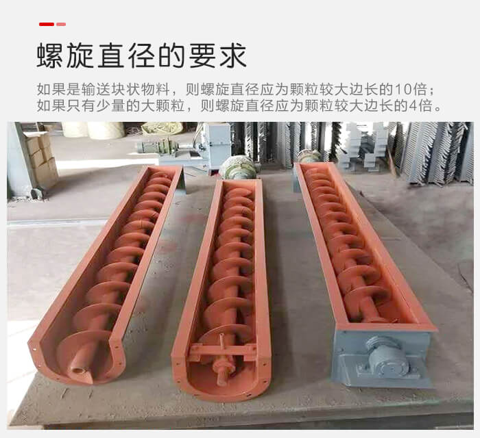 5.螺旋直徑對于絞龍輸送機(jī)的螺旋直徑來講,應(yīng)滿足的要求有:如果是輸送塊狀物料,則螺旋直徑應(yīng)為顆粒較大邊長的10倍;如果只有少量的大顆粒,則螺旋直徑應(yīng)為顆粒較大邊長的4倍。