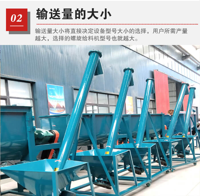 輸送量大小將直接決定設(shè)備型號大小的選擇,用戶所需產(chǎn)量越大,選擇的螺旋給料機(jī)型號也就越大,用戶需要結(jié)合自身對產(chǎn)量的需求來選擇合適的型號。