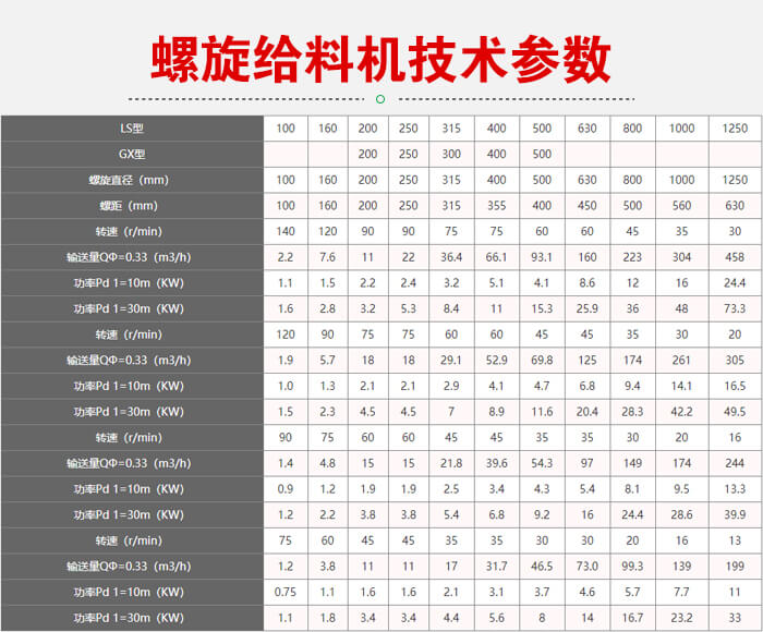 附 螺旋給料機(jī)參數(shù)表: