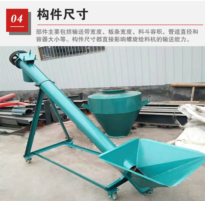 主要包括輸送帶寬度、板條寬度、料斗容積、管道直徑和容器大小等。這些構(gòu)件尺寸都直接影響螺旋給料機(jī)的輸送能力。如螺旋輸送機(jī)管徑越大,效率也就越高。當(dāng)然,并不一定就是輸送機(jī)本身才能影響效率,物料的各種性質(zhì)也都會對效率有所影響。