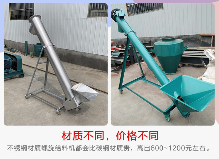 螺旋給料機可以分為碳鋼和不銹鋼材質(zhì)兩種,由于這兩者材質(zhì)成本有差異,碳鋼螺旋給料機適合普通物料輸送,不銹鋼螺旋給料機主要用于輸送機一些腐蝕性、高溫物料,也用于食品、醫(yī)藥等對輸送環(huán)境有衛(wèi)生標準的行業(yè),所以不銹鋼材質(zhì)螺旋給料機都會比碳鋼材質(zhì)貴,一般會高出600~1200元左右。
