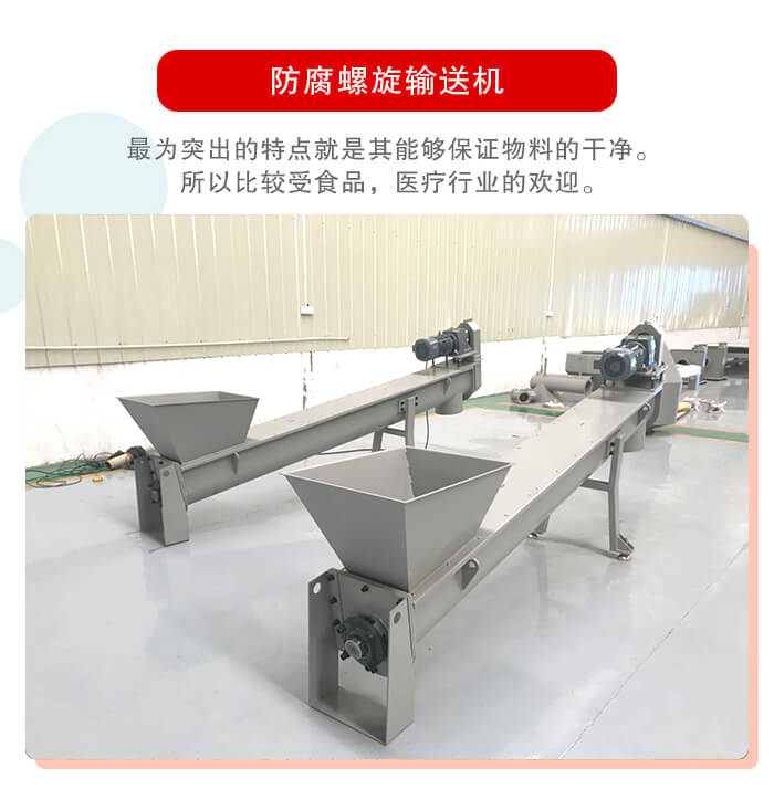 防腐螺旋輸送機其主要的輸送物料,就是一些:面粉,淀粉等的粉狀物料。如果先要輸送一些重量相對面粉較重的物料,其就要選擇一些相對較貴的防腐螺旋輸送機了。因為螺旋輸送機的輸送還是用來輸送物料的。物料有了一定的差距其螺旋輸送機頁是要重新選擇的。