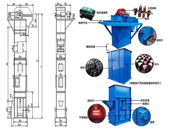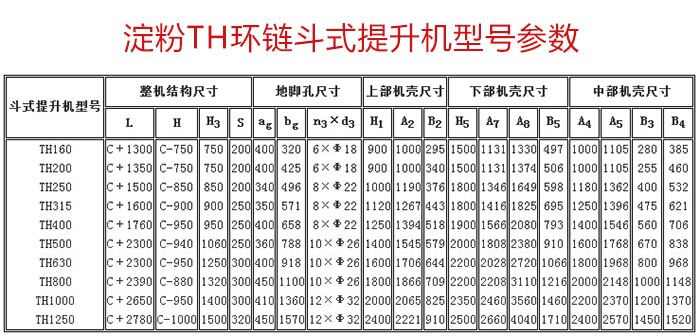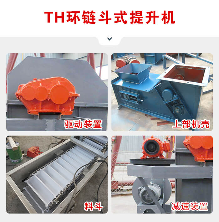TH環(huán)鏈斗式提升機(jī)是一種常用的高效提升設(shè)備,提升產(chǎn)量大、效率高,主要由運行部件、牽引件(輸送鏈)、驅(qū)動裝置、上部裝置、中部機(jī)殼、下部裝置、加料口(入料口)和卸料口(出料口)組成??蛇m用與淀粉的高速提升輸送。