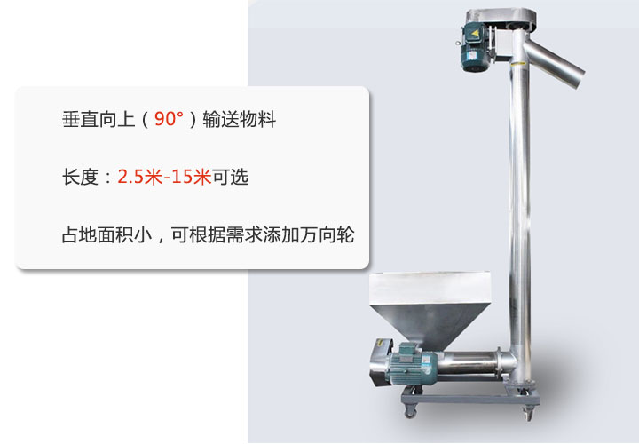 垂直螺旋輸送機(jī)用于解決需要垂直向上(90°)輸送物料的難題,其長度2.5米-15米,大家可根據(jù)需要選擇長度;相比普通螺旋輸送機(jī),該款設(shè)計(jì)更好的節(jié)約了占地面積,也可根據(jù)場地需要添加移動(dòng)輪,方便來回移動(dòng)。