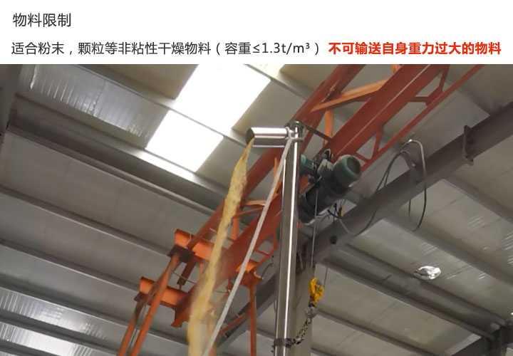 垂直螺旋輸送機(jī)只用于輸送粉末或固體顆粒等非粘性干燥物料(容重≤1.3t/m³),因?yàn)槠洳捎孟蛏陷斔?,在輸送過程中物料自身重力如果過重,會(huì)造成輸送難以進(jìn)行。