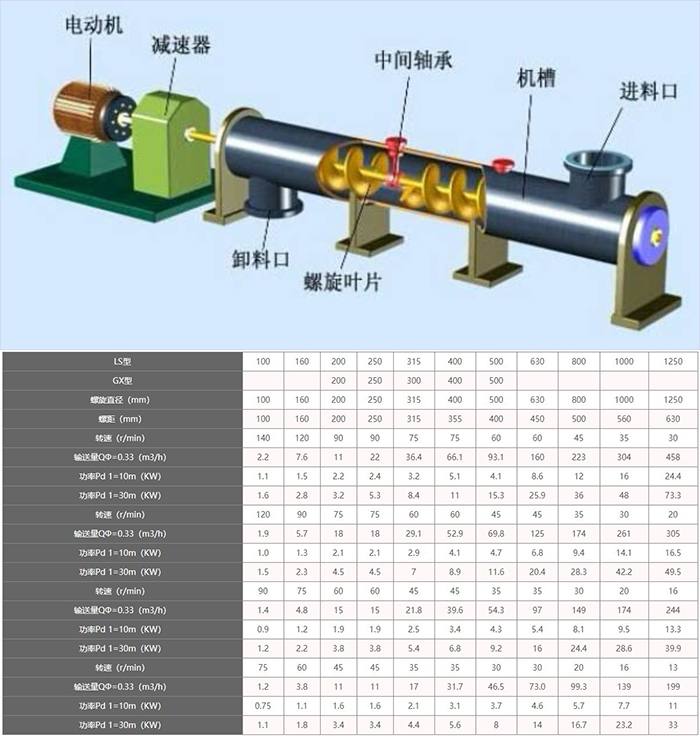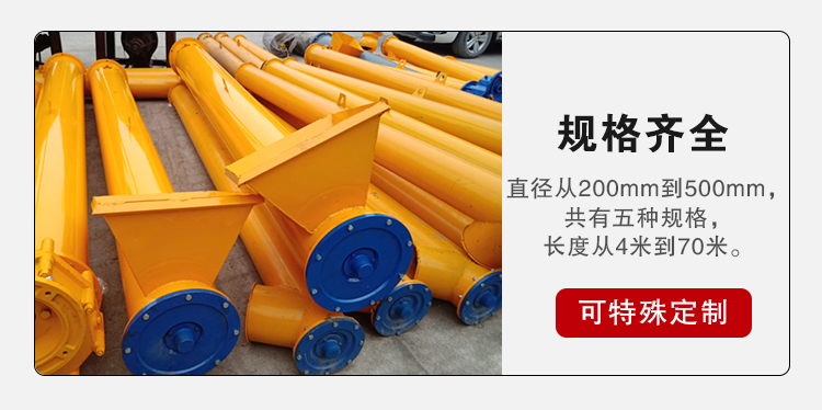 螺旋直徑從 200 毫米到 500 毫米,共有五種規(guī)格,長度從 4 米 到 70 米 ,每隔 0.5 米一檔,選型時符合標(biāo)準(zhǔn)公稱長度,特殊需要可在選配節(jié)中另行提出。