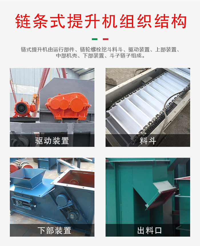 鏈條式提升機(jī)由運(yùn)行部件、鏈輪螺栓挖斗料斗、驅(qū)動(dòng)裝置、上部裝置、中部機(jī)殼、下部裝置、斗子鏈子組成。