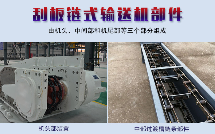 各種類型的刮板鏈?zhǔn)捷斔蜋C(jī)的主要結(jié)構(gòu)和組成的部件基本是相同的,它由機(jī)頭、中間部和機(jī)尾部等三個(gè)部分組成。此外,還有供推移輸送機(jī)用的液壓千斤頂裝置和緊鏈時(shí)用的緊鏈器等附屬部件。機(jī)頭部由機(jī)頭架、電動(dòng)機(jī)、液力偶合器、減速器及鏈輪等件組成。中部由過(guò)渡槽、中部槽、鏈條和刮板等件組成。機(jī)尾部是供刮板鏈返回的裝置。重型刮板輸送機(jī)的機(jī)尾與機(jī)頭一樣,也設(shè)有動(dòng)力傳動(dòng)裝置,從安設(shè)的位置來(lái)區(qū)分叫上機(jī)頭與下機(jī)頭。