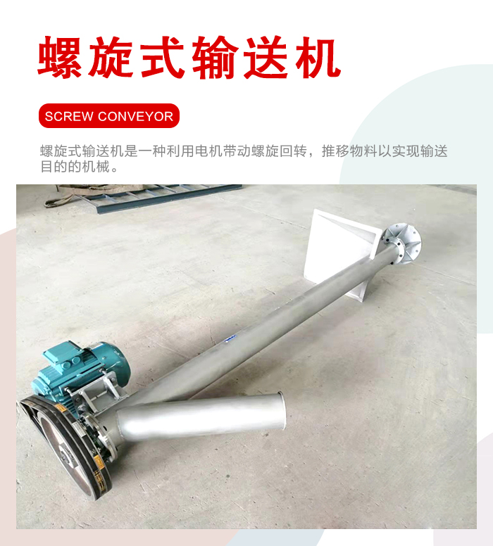 簡介:螺旋式輸送機(jī)是一種利用電機(jī)帶動螺旋回轉(zhuǎn),推移物料以實現(xiàn)輸送目的的機(jī)械。
