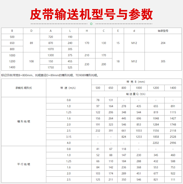 輸送量大小決定型號(hào)及電機(jī)功率的選擇,輸送量越大的皮帶輸送機(jī),應(yīng)選較高的帶速,型號(hào)也就越大。